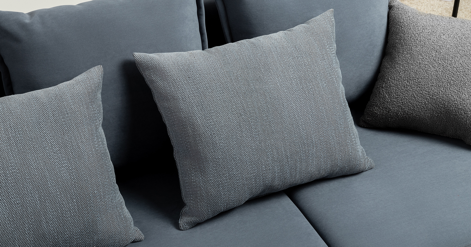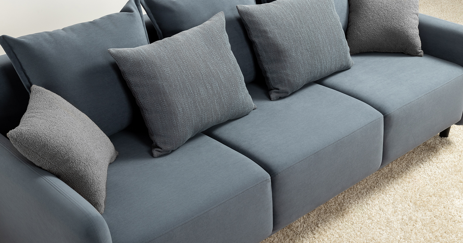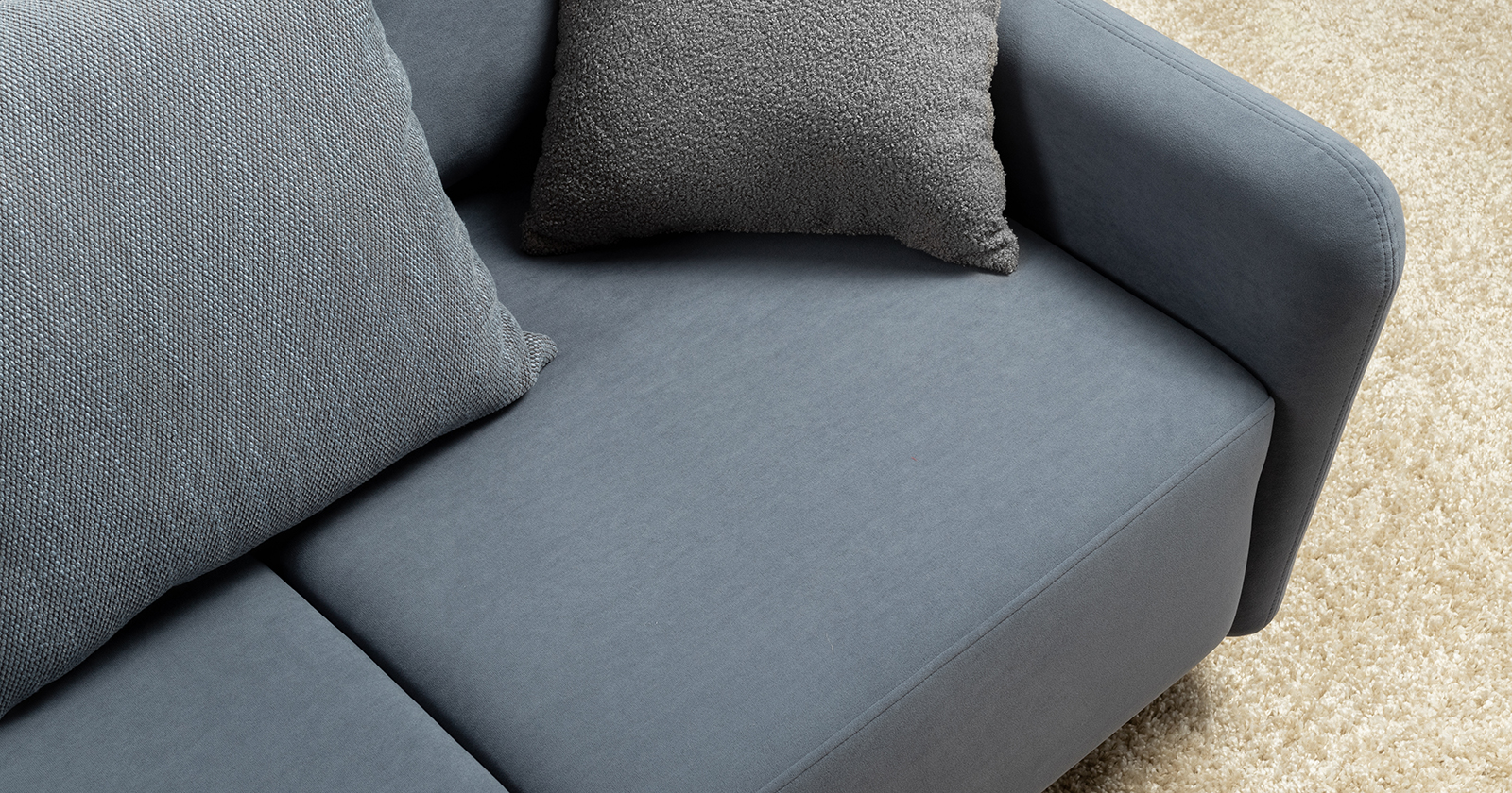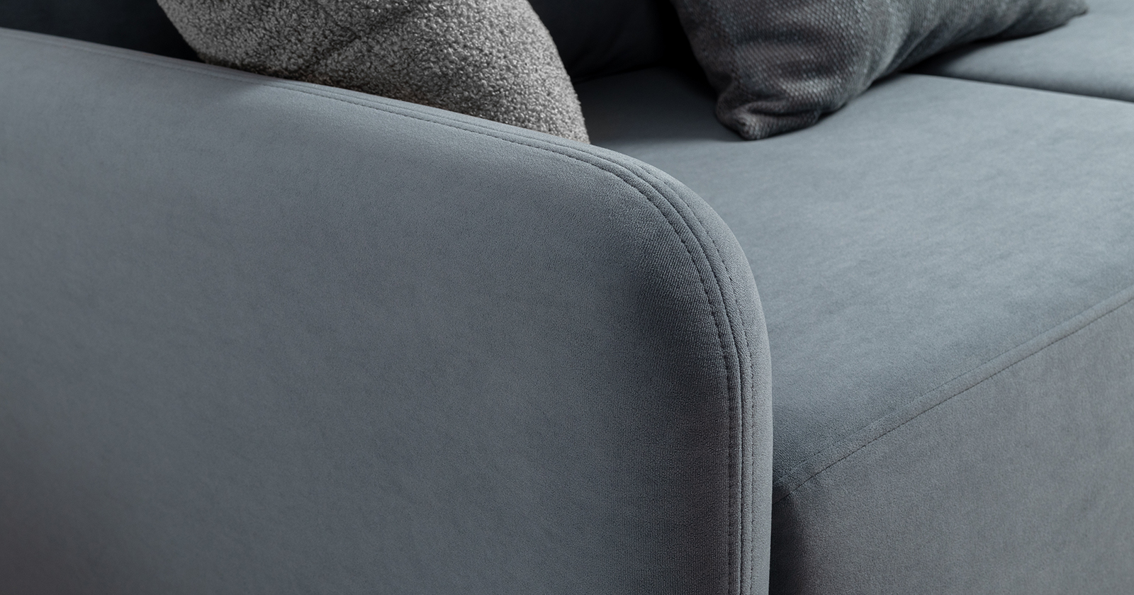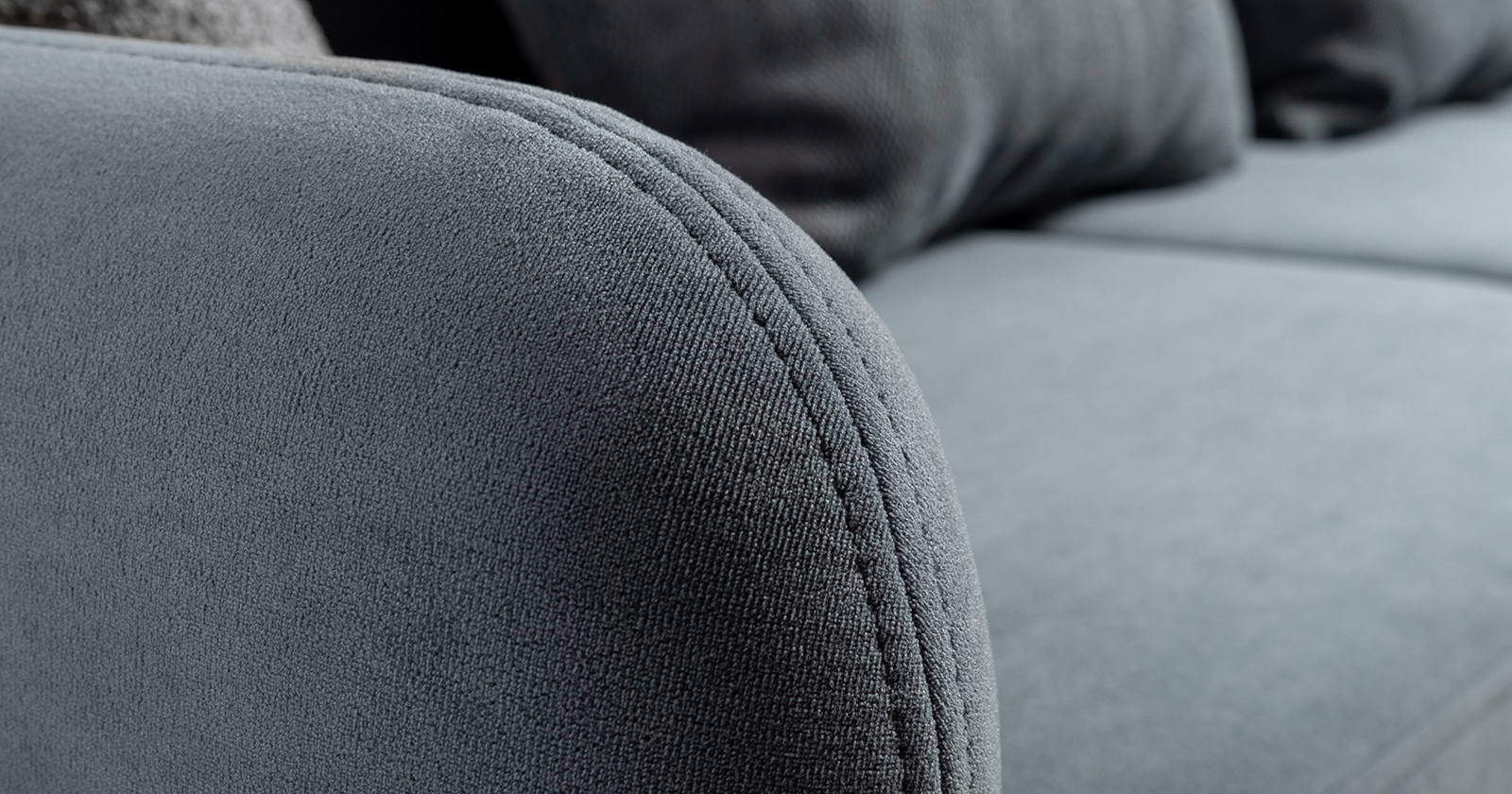 В комплекте 5 двусторонних приспинных подушки и 2 декоративные думки. Задняя спинка в ткани основы. Декоративные отделочные строчки по боковинам и сиденью