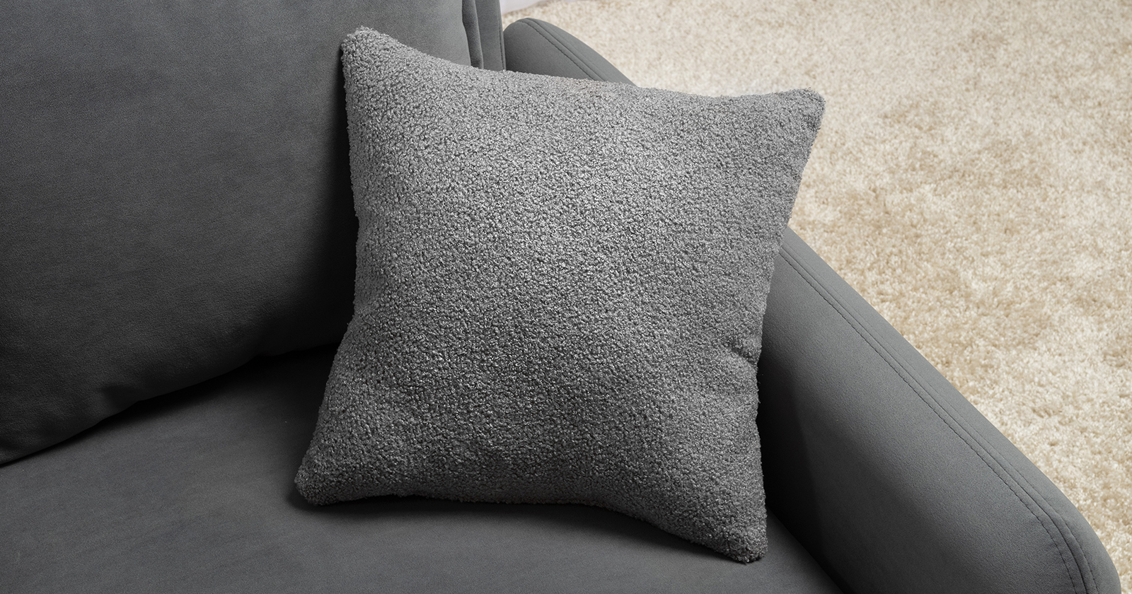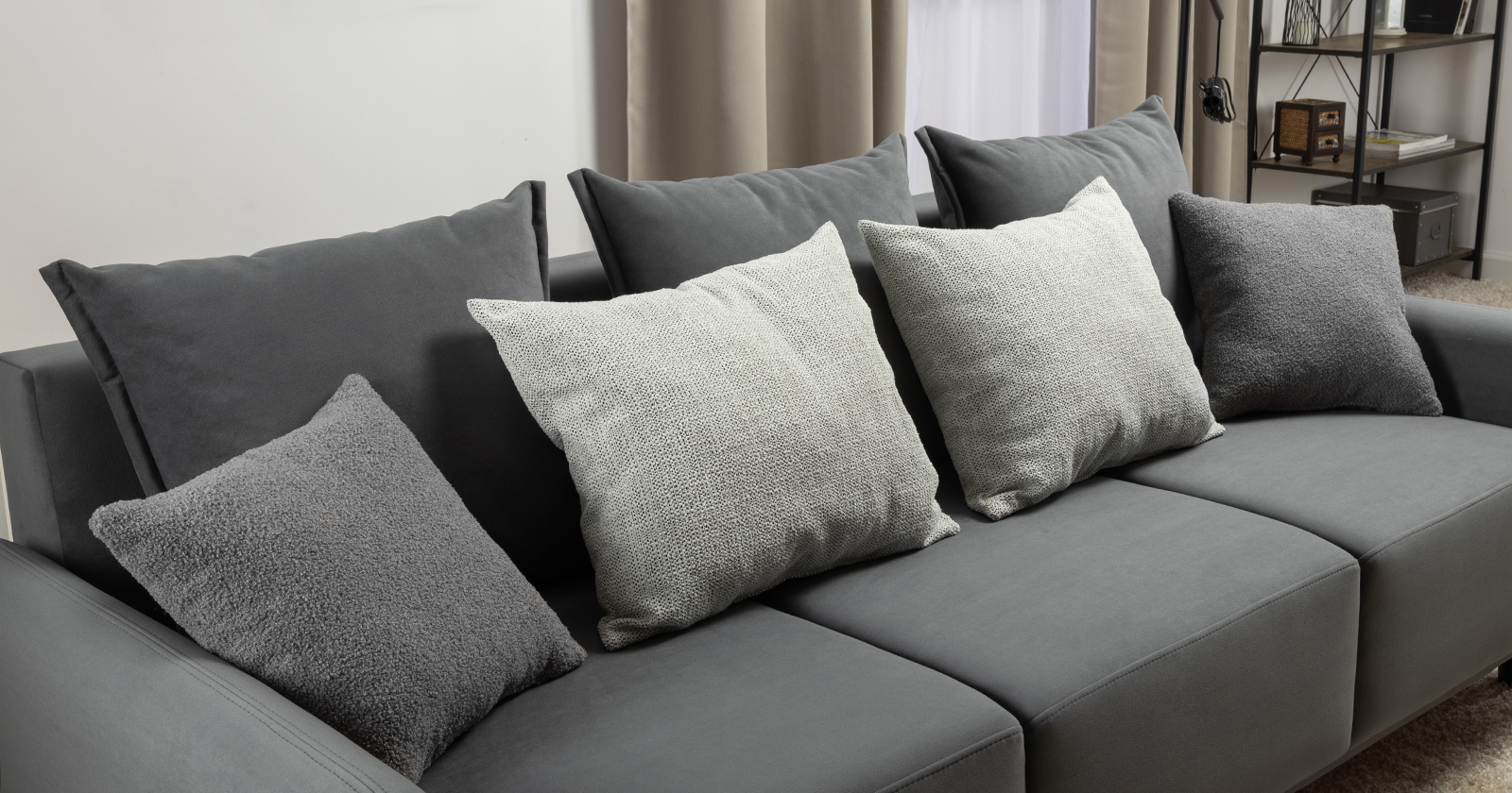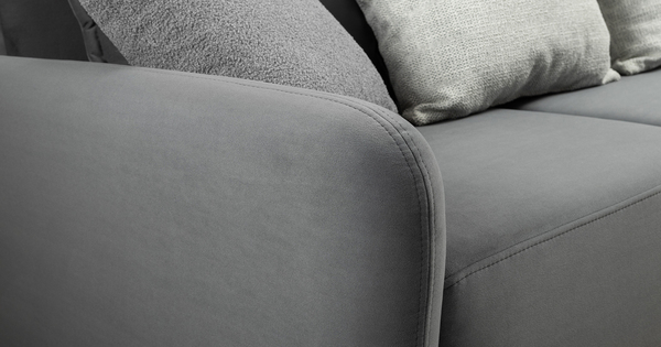 В комплекте 5 двусторонних приспинных подушки и 2 декоративные думки. Задняя спинка в ткани основы. Декоративные отделочные строчки по боковинам и сиденью