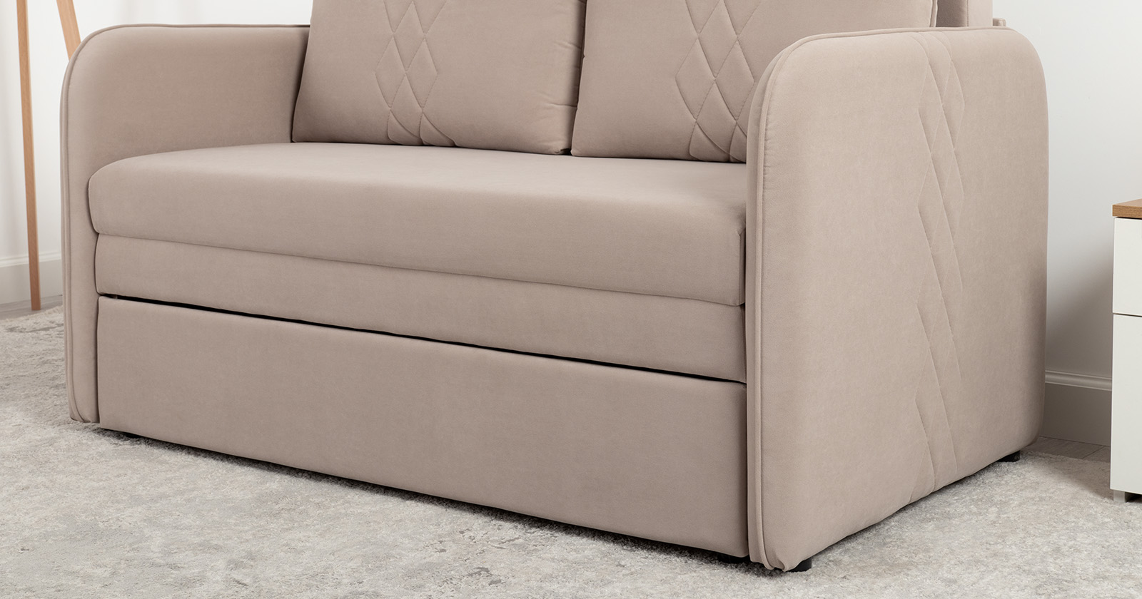 Стильный компактный диван для детской и гостиной. При своих скромных размерах он трансформируется в полноценное спальное место для детей и подростков. Лаконичный дизайн в виде декоративной стежки подчеркивает фактуру велюра, а небольшие размеры позволят разместить его в любом пространстве.