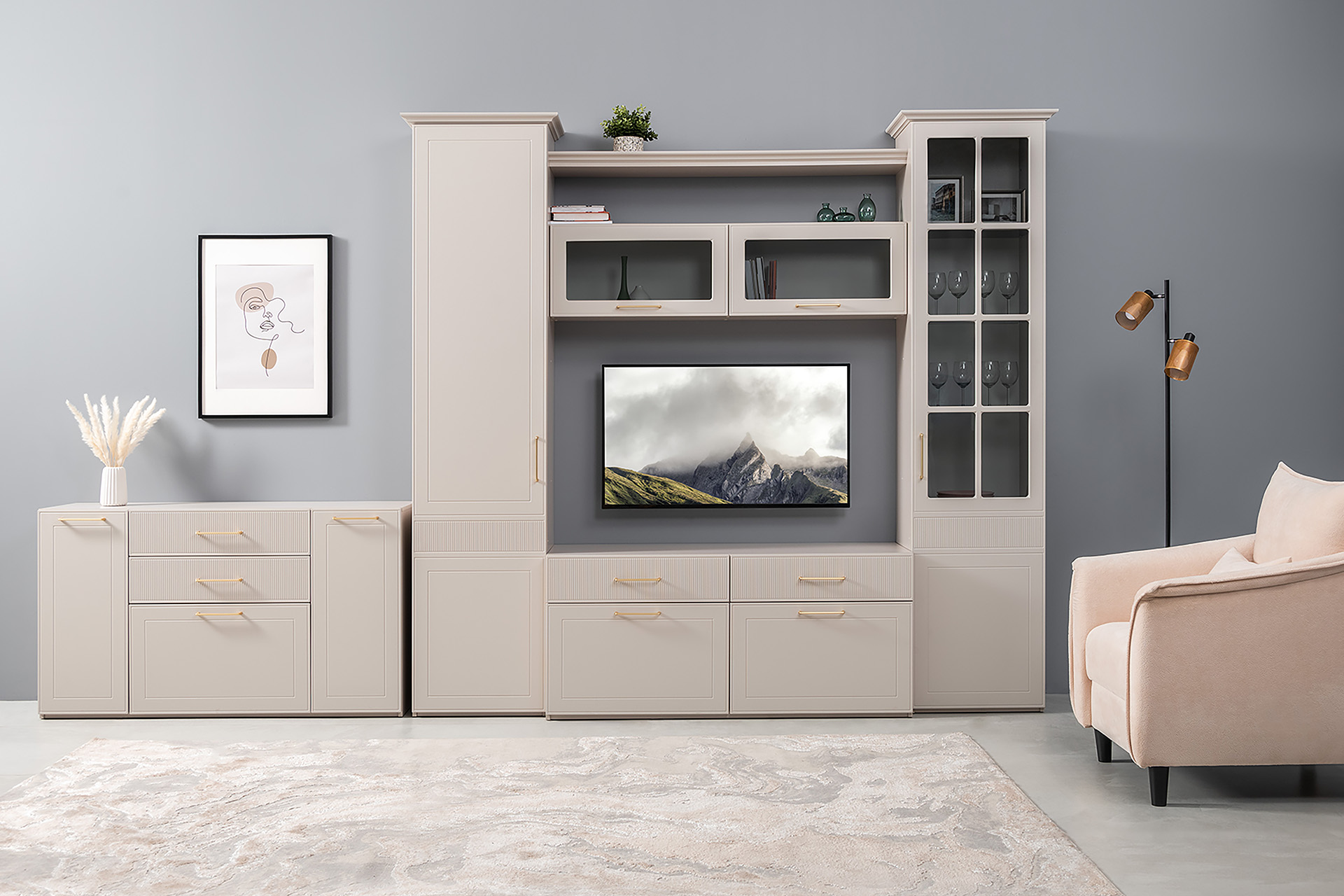 Гостиная Ричфорд композиция 2 с карнизами, кашемир 5981 BS, моно керамика D166-2 ПВХ, белый PE шагрень (собирается на любую сторону)