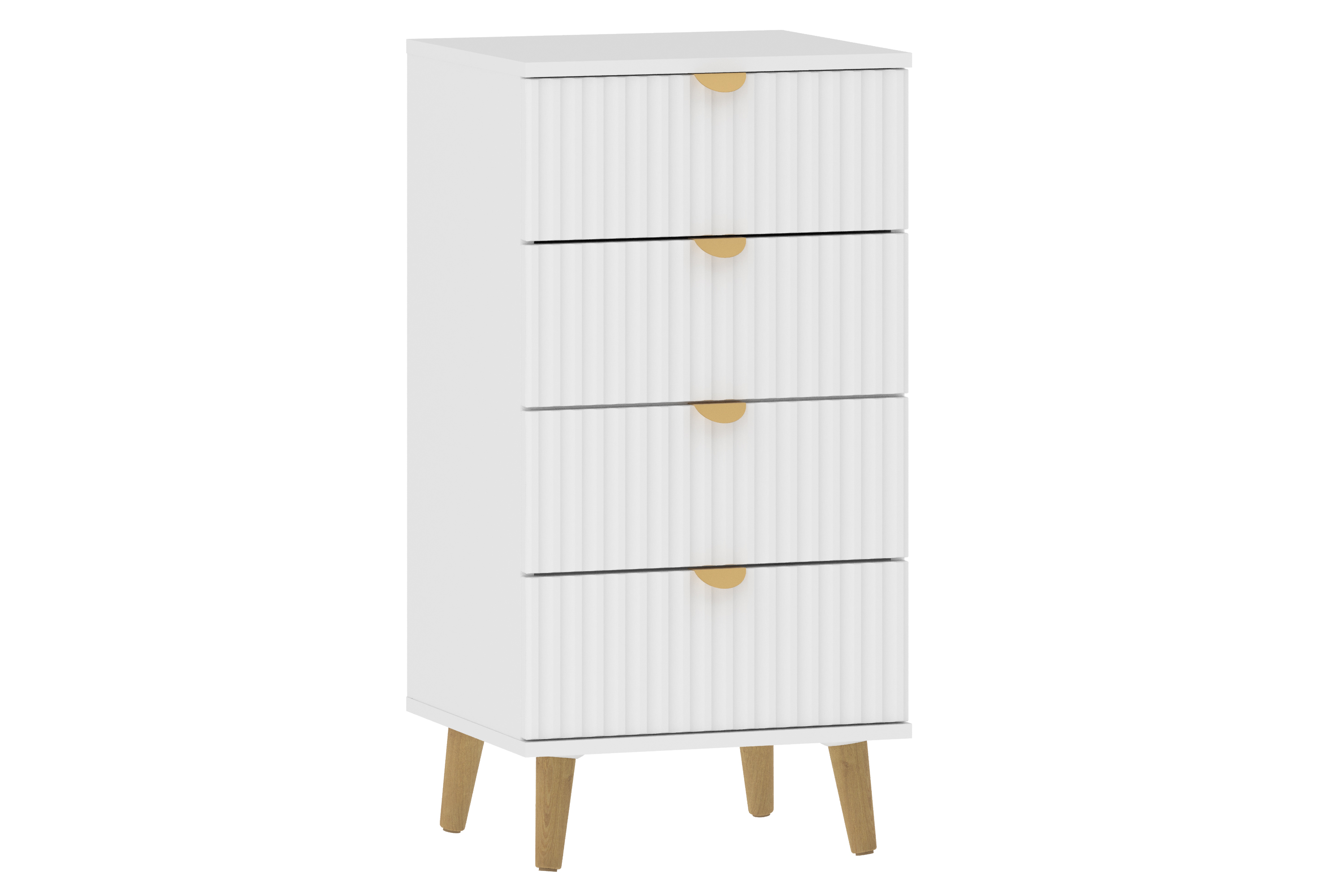 Комод оснащен четырьмя выдвижными ящиками, которые открываются плавно и бесшумно благодаря шариковым направляющим, а высокие опоры облегчают процесс уборки.