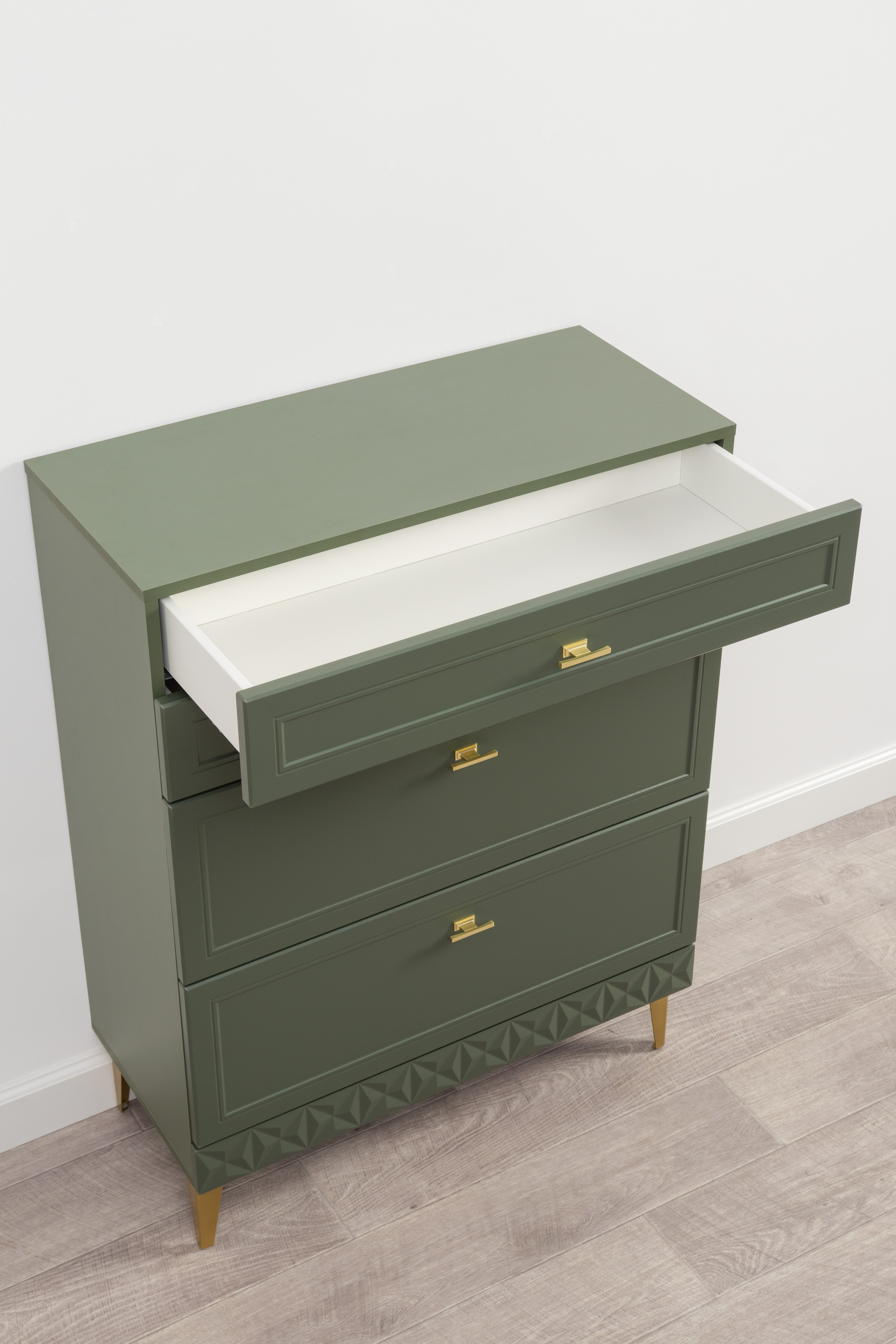 Комод Марион 16.249 дымчатый зеленый K521, олива шагрень AG 1050 ПВХ, белый PE шагрень