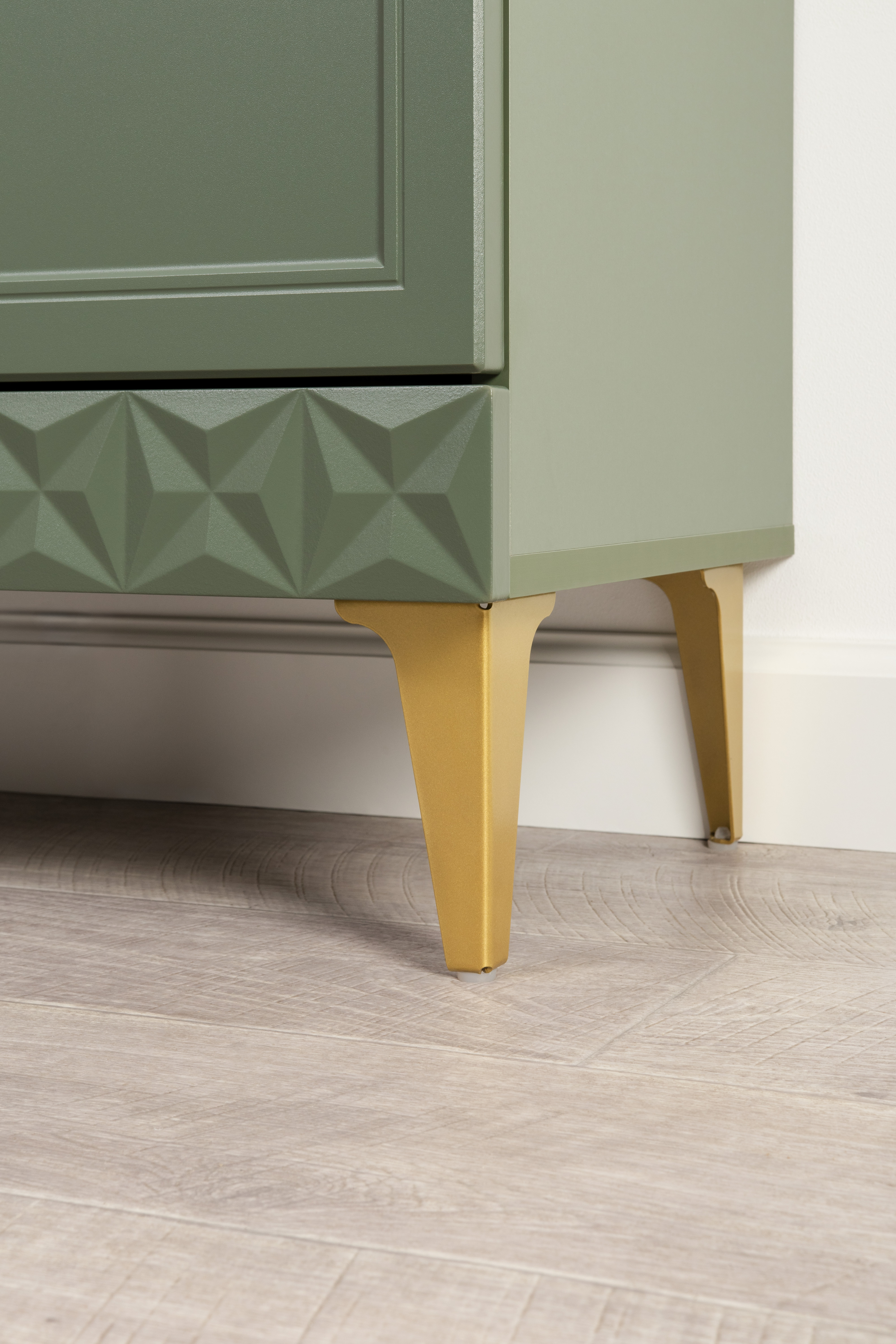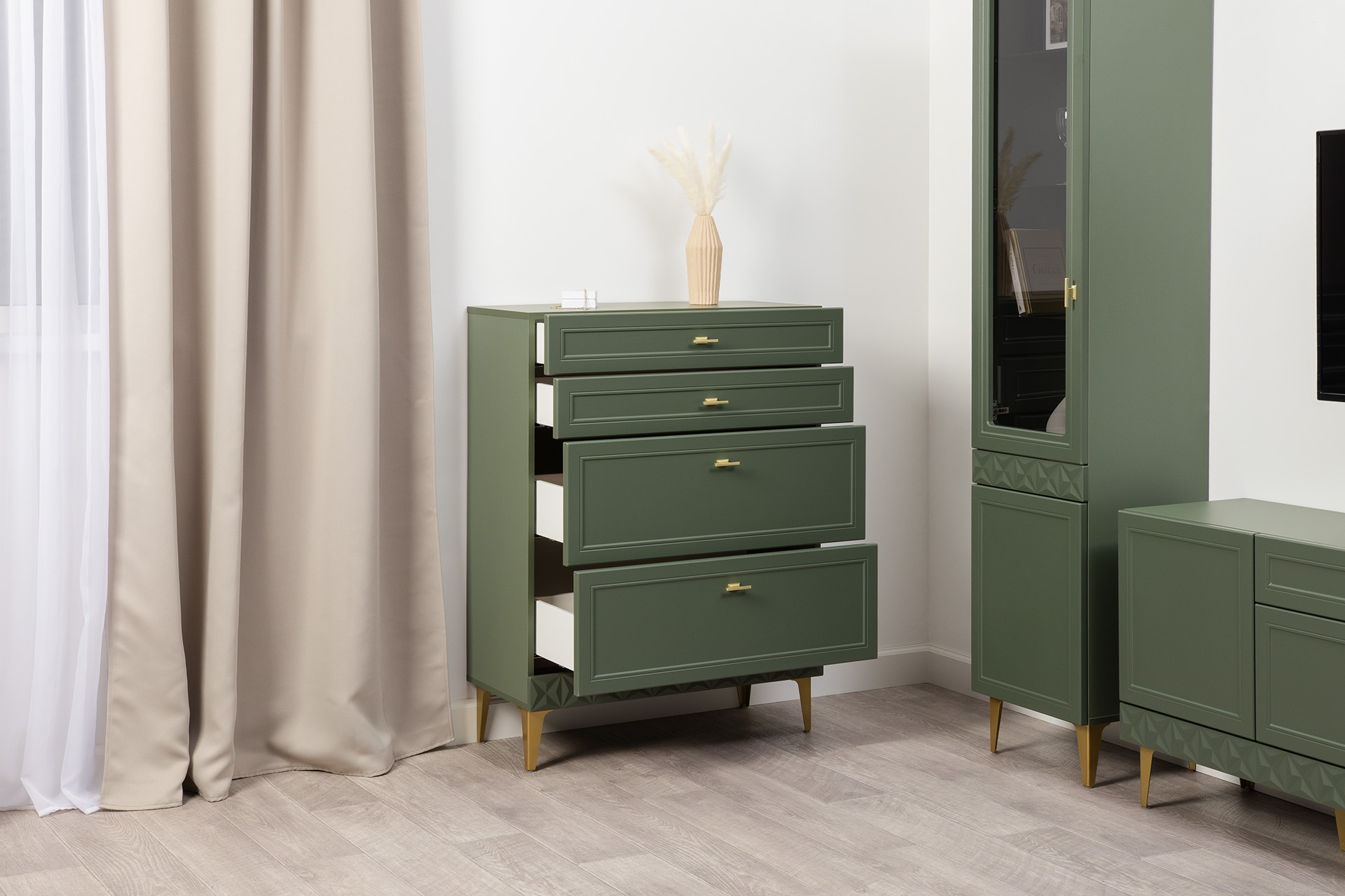 Изящные линии, глубокая фрезеровка фасадов из МДФ и благородные оттенки. Утончённая «Слоновая кость» и изысканная «Олива Шагрень» с глубоким зелёным тоном — создают атмосферу уюта, тепла и благородства. Металлические ручки и опоры золотого цвета придают мебели утончённый блеск, а петли и направляющие с доводчиками обеспечивают плавное и бесшумное закрытие фасадов.