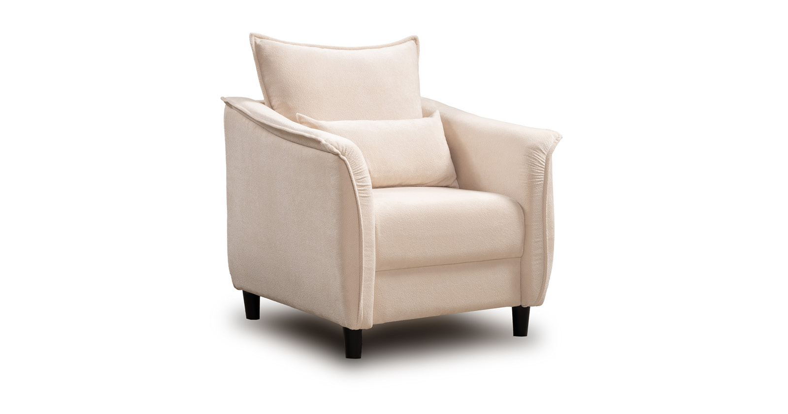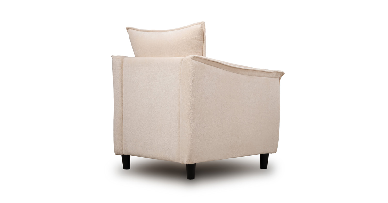 Кресло с приспинной подушкой трапецивидной формы на молнии, по трем сторонам которой проложена отделочная строчка на 1,2 см. По контуру боковин проложен декоративный кант на 1,2 см основной ткани. Кант проходит по центру передней части боковины, а по внутренней верхней части сборка.