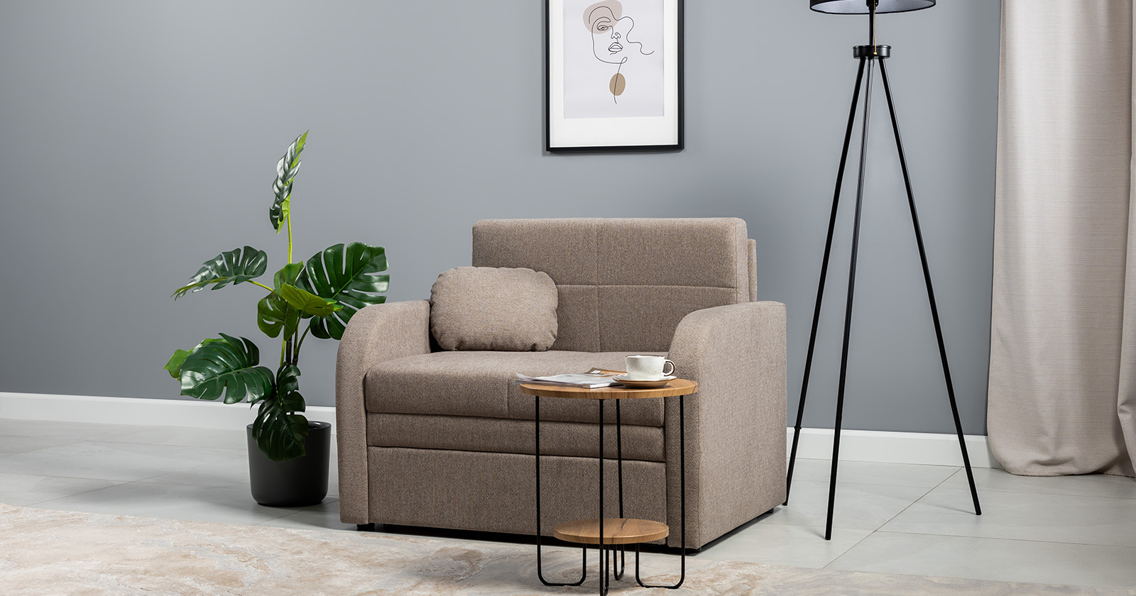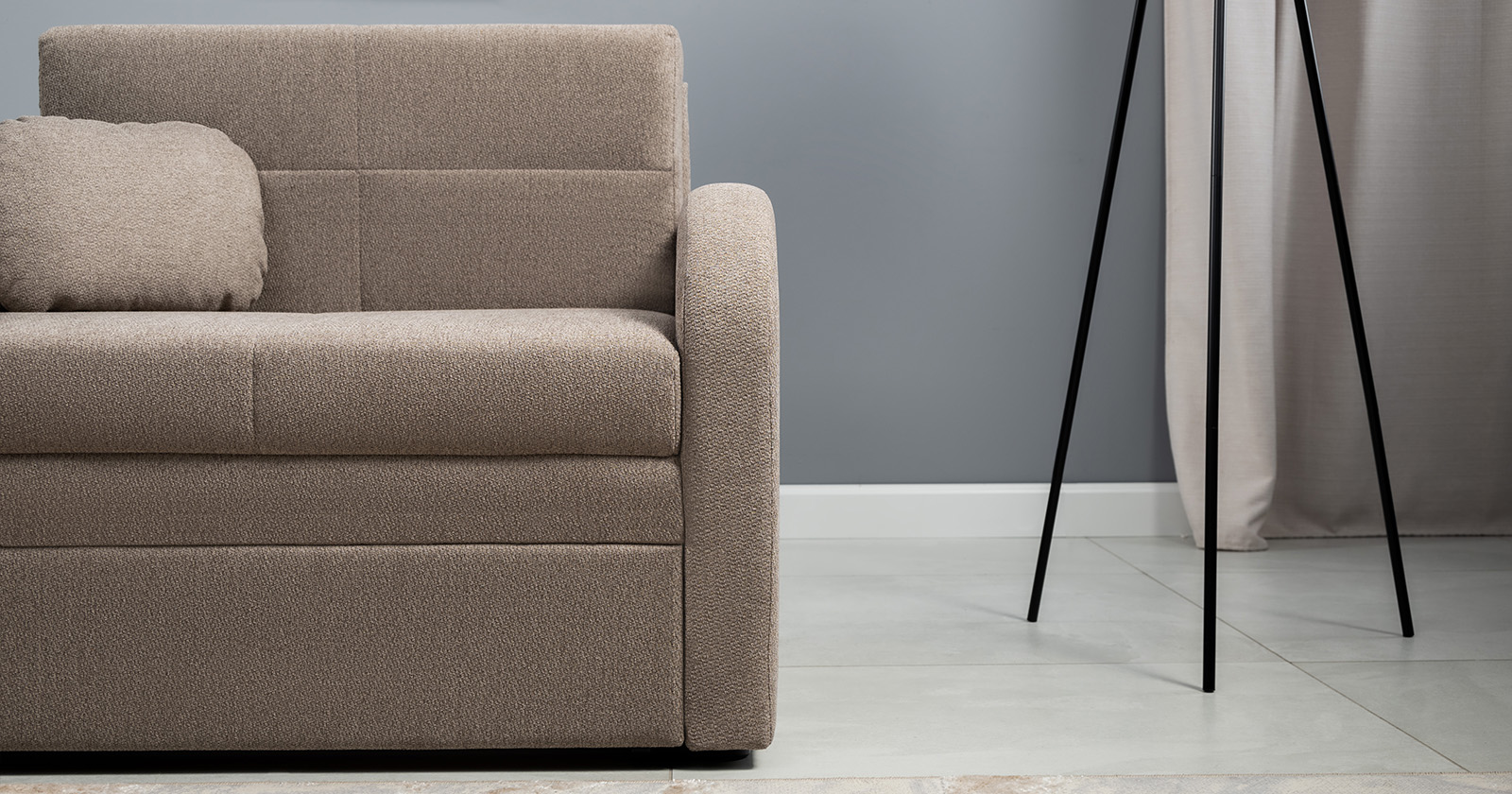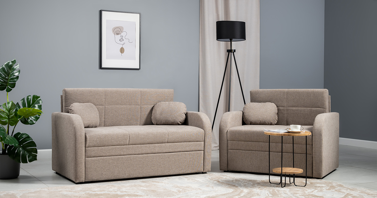 Коллекция выполнена в современном минималистичном стиле с мягкой обивкой из износостойкой ткани и декоративной стежкой, подчеркивающей геометрию форм. Механизм трансформации обеспечивает дополнительное спальное место, делая мебель не только эстетичной, но и максимально функциональной для небольших пространств.