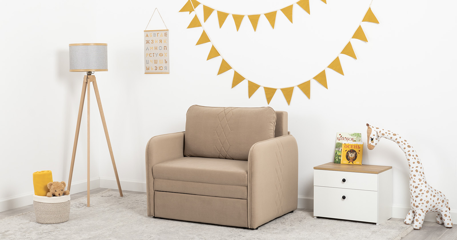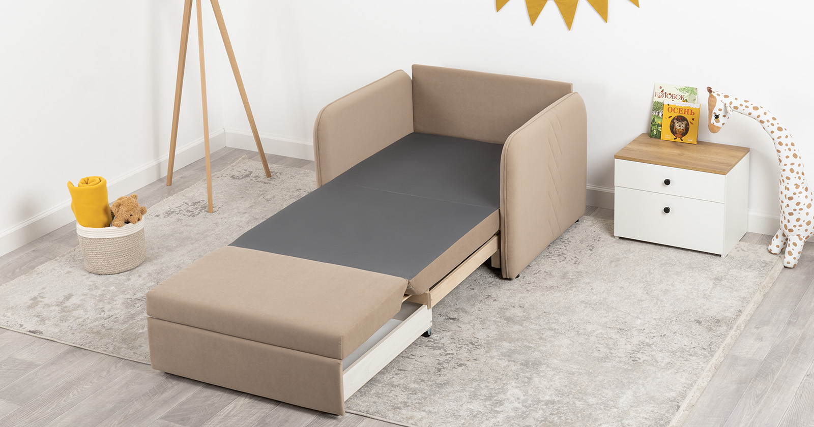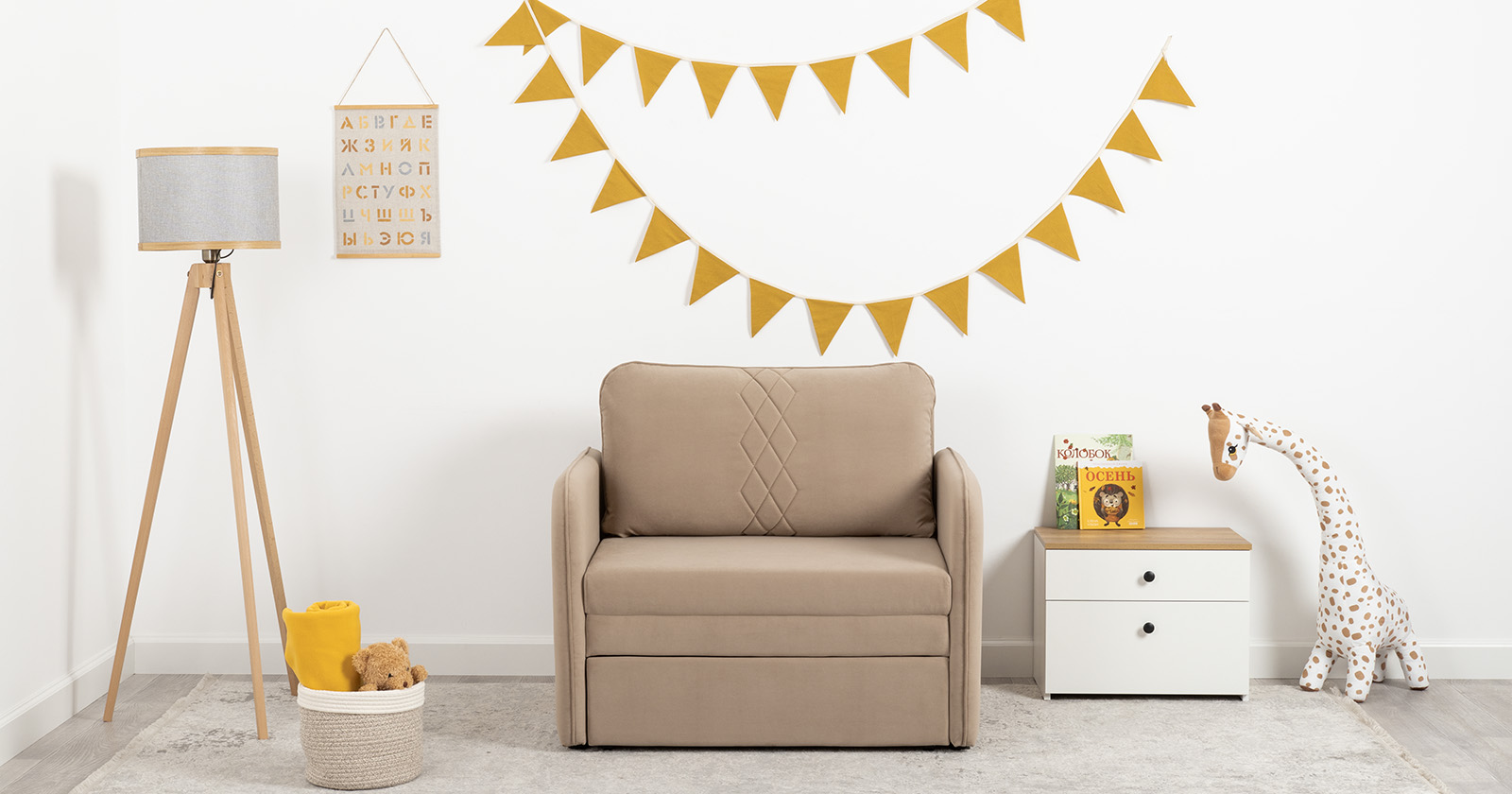 Стильный компактный диван для детской и гостиной. При своих скромных размерах он трансформируется в полноценное спальное место для детей и подростков. Лаконичный дизайн в виде декоративной стежки подчеркивает фактуру велюра, а небольшие размеры позволят разместить его в любом пространстве.