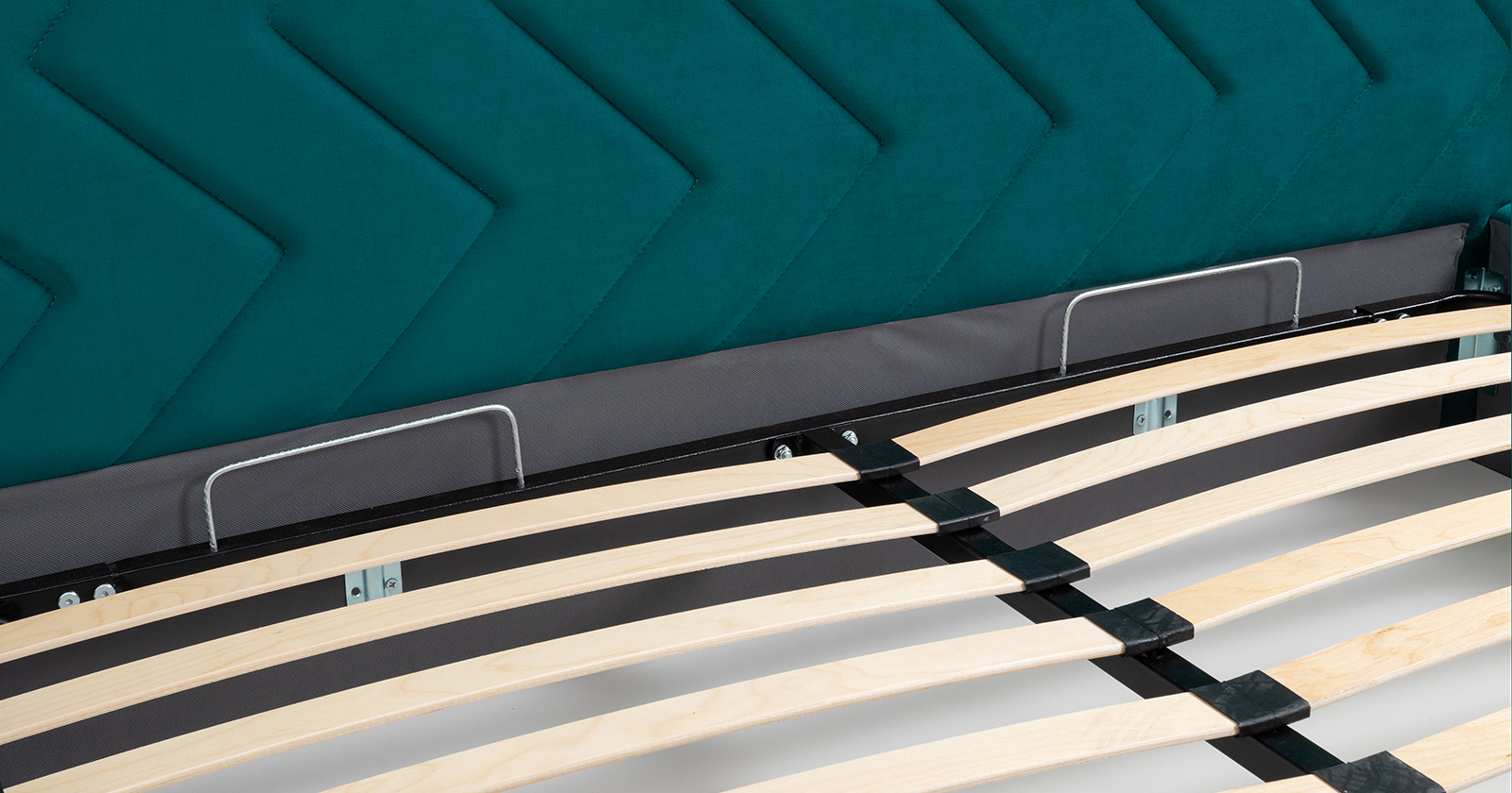 Основание кровати укомплектовано матрасодержателями. Жесткое кроватное дно из ЛДСП 16 мм. Задняя стенка изголовья выполнена в тех. ткани (спанбонд).