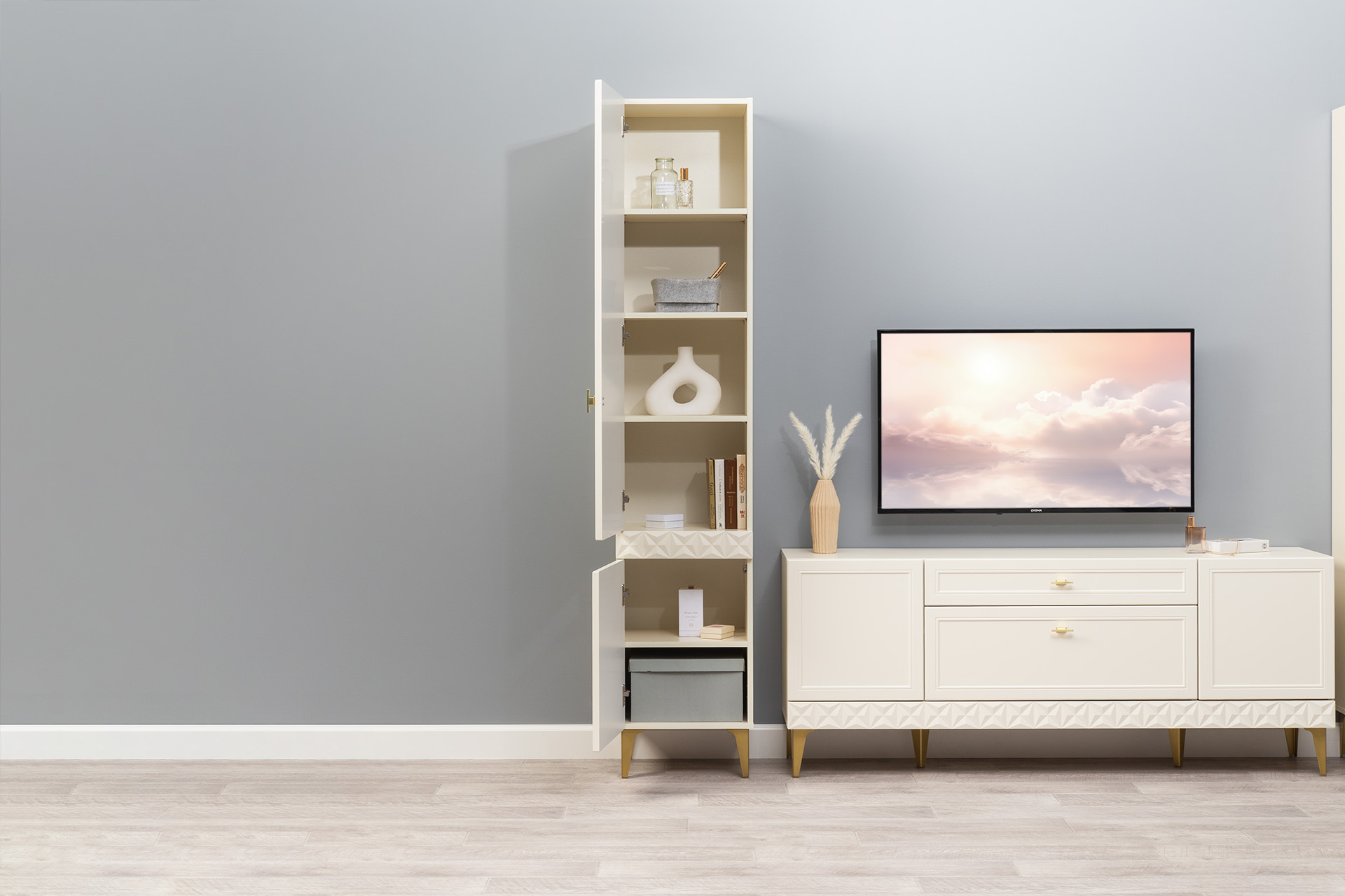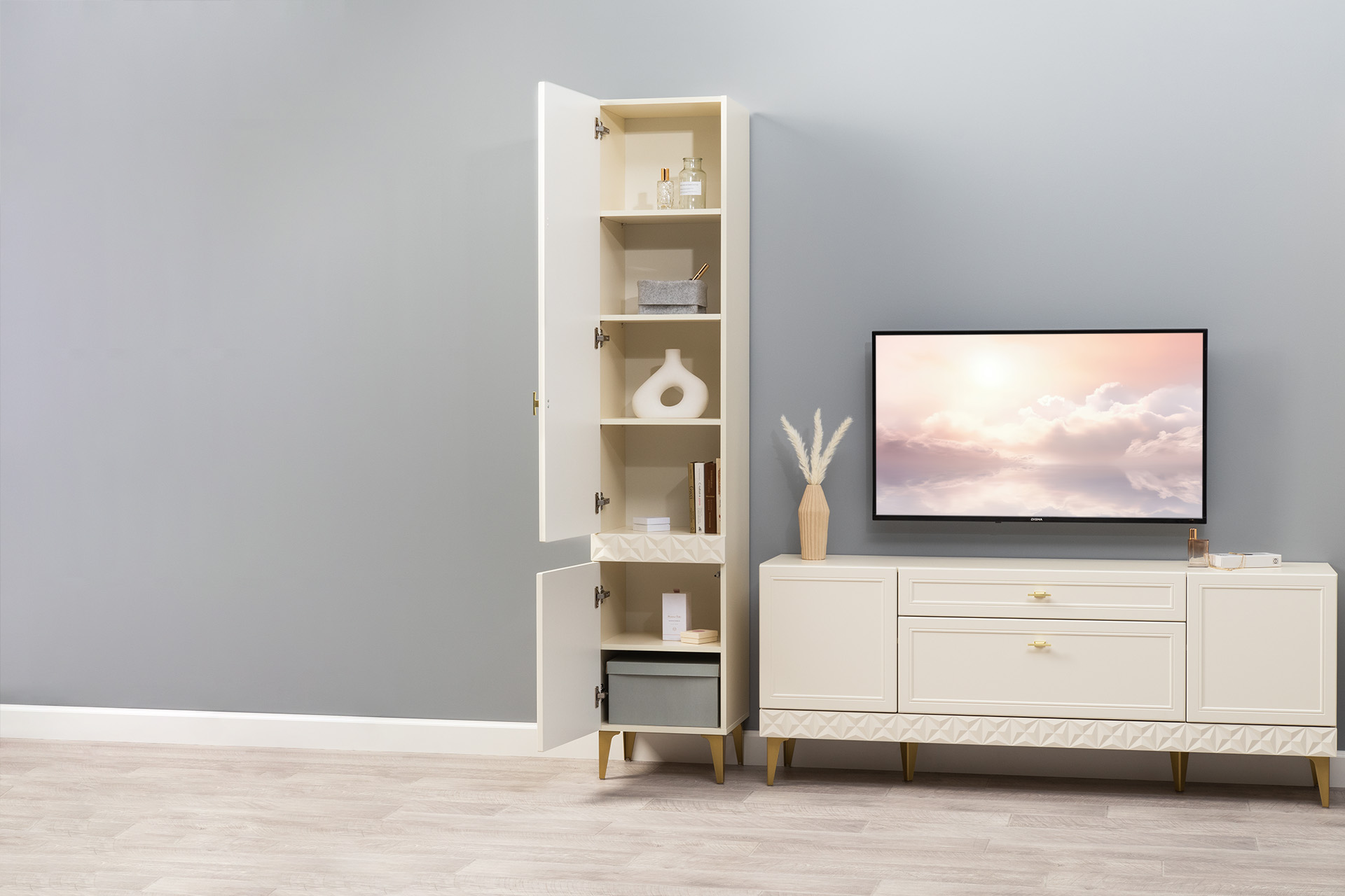 Изящные линии, глубокая фрезеровка фасадов из МДФ и благородные оттенки. Утончённая «Слоновая кость» и изысканная «Олива Шагрень» с глубоким зелёным тоном — создают атмосферу уюта, тепла и благородства. Металлические ручки и опоры золотого цвета придают мебели утончённый блеск, а петли и направляющие с доводчиками обеспечивают плавное и бесшумное закрытие фасадов.