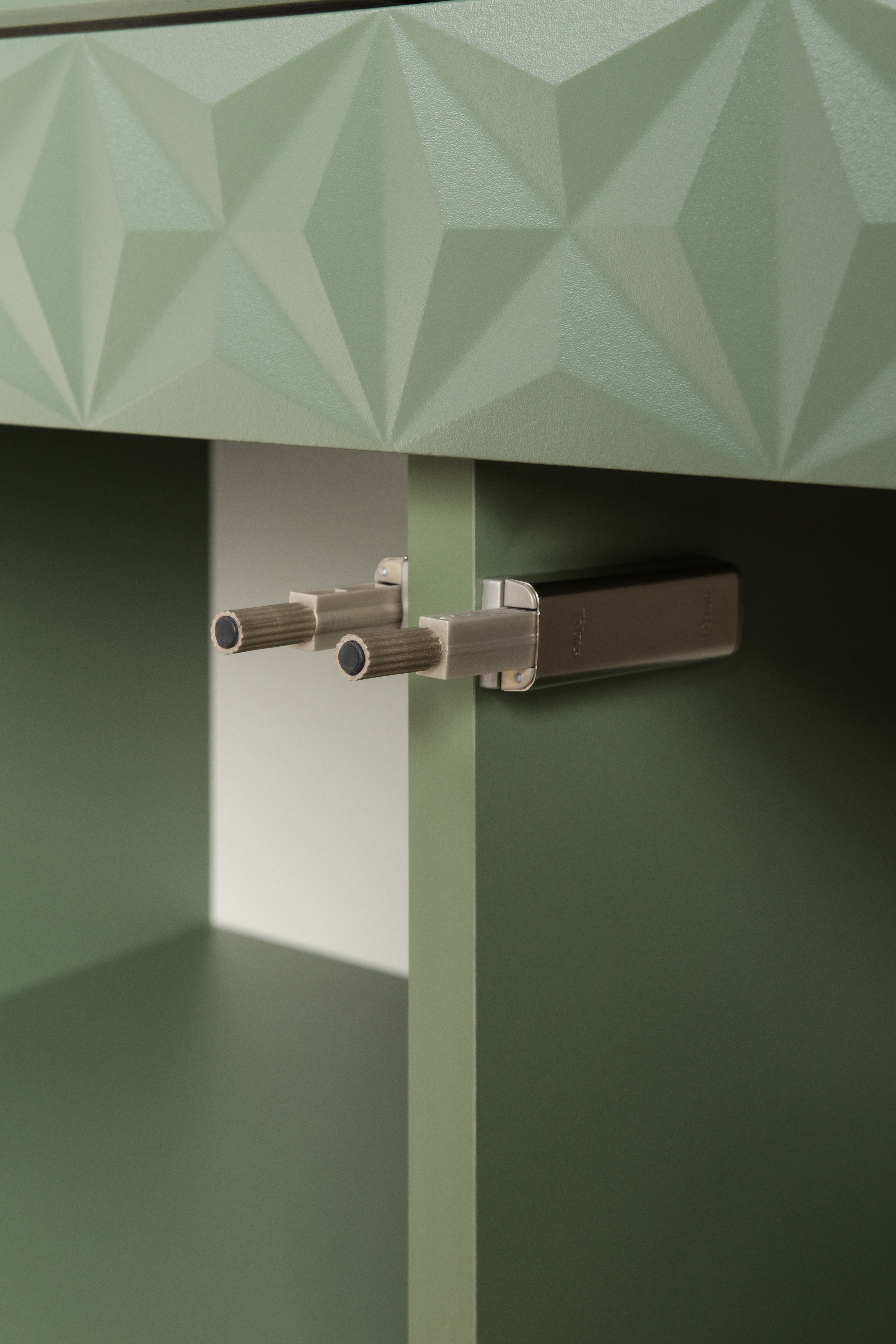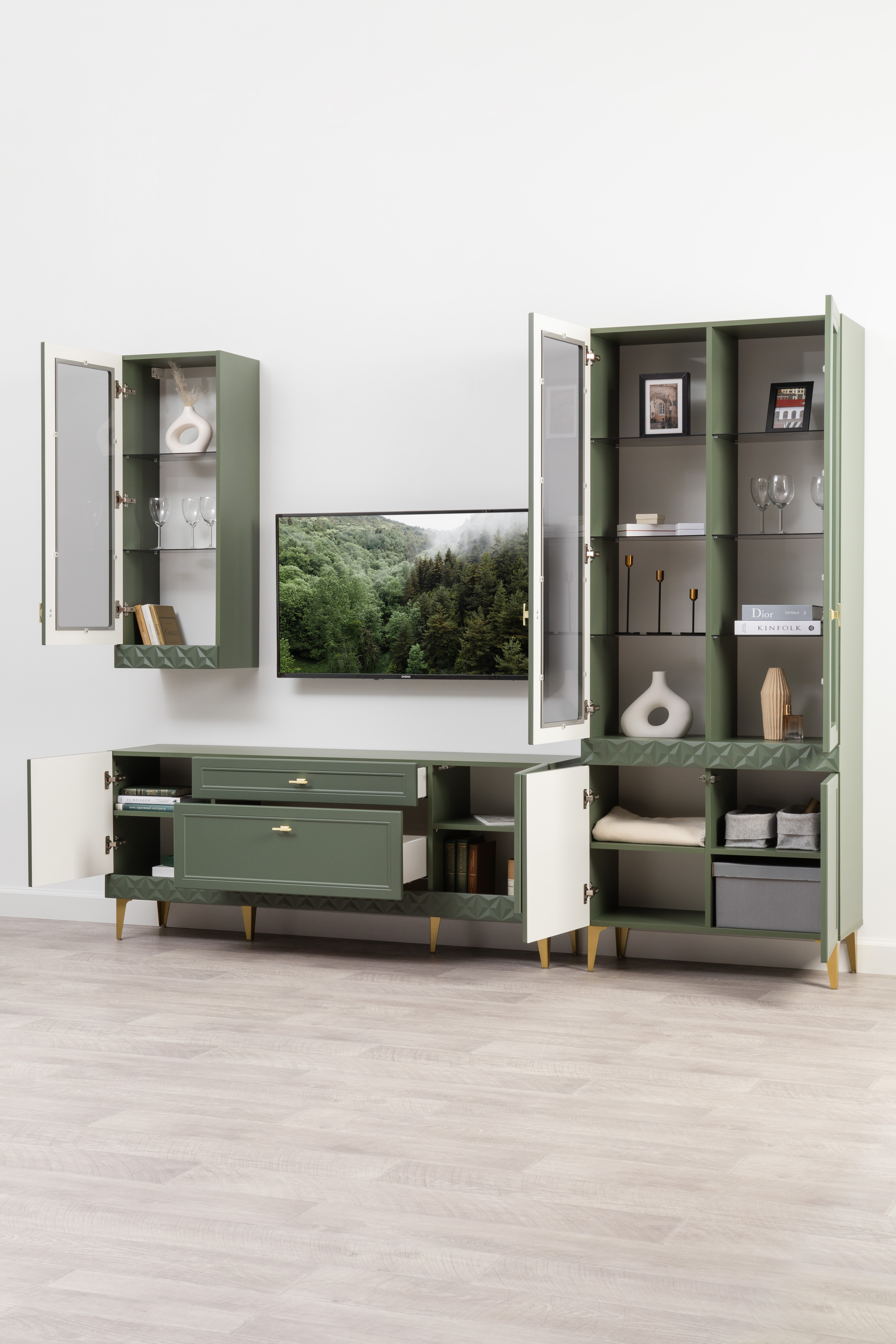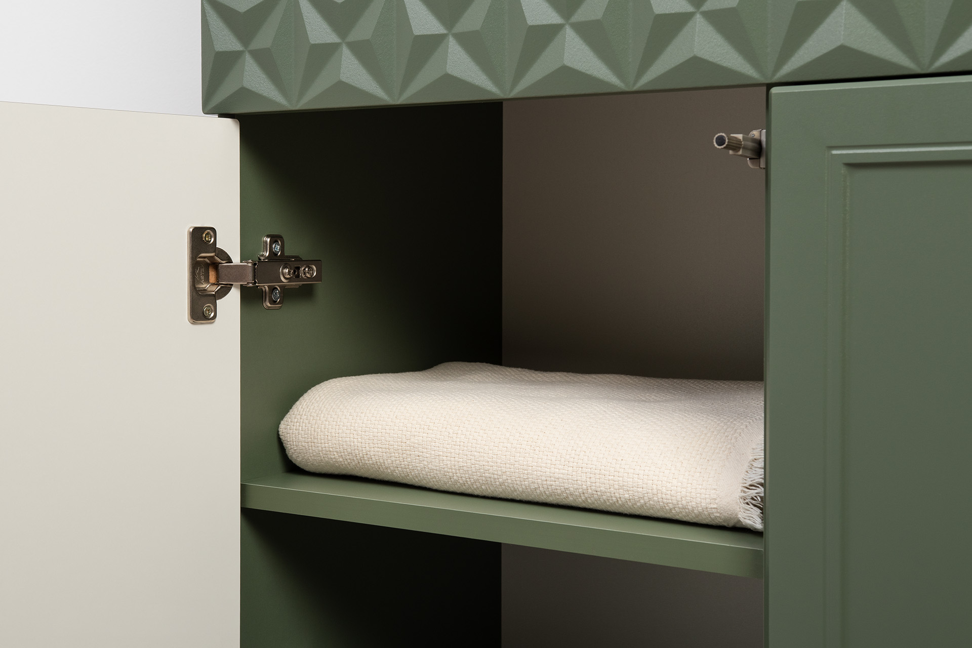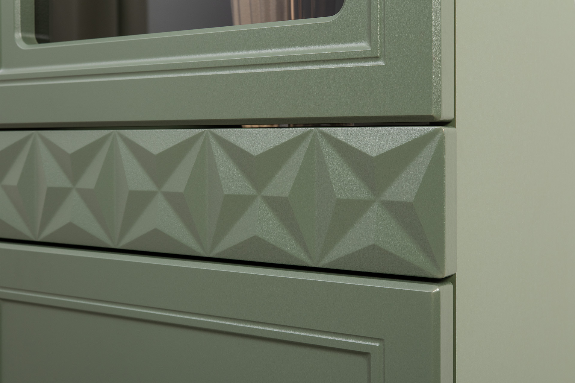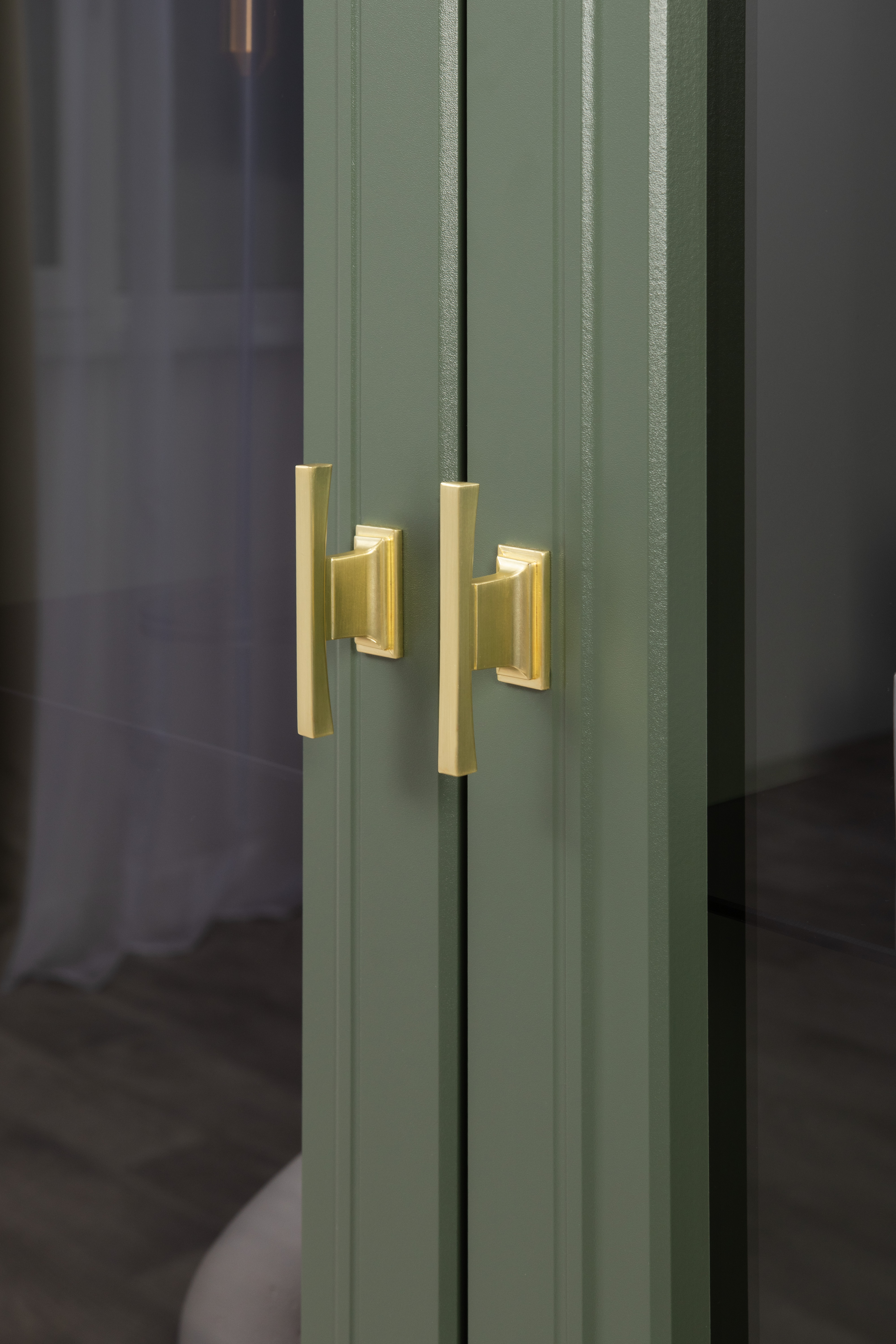 Изящные линии, глубокая фрезеровка фасадов из МДФ и благородные оттенки. Утончённая «Слоновая кость» и изысканная «Олива Шагрень» с глубоким зелёным тоном — создают атмосферу уюта, тепла и благородства. Металлические ручки и опоры золотого цвета придают мебели утончённый блеск, а петли и направляющие с доводчиками обеспечивают плавное и бесшумное закрытие фасадов.