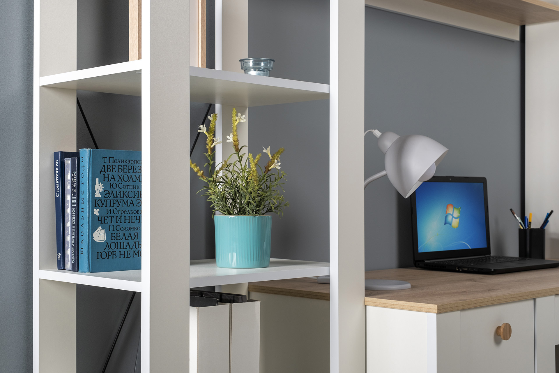 Стеллаж Альфа 09.135 солнечный свет, белый премиум, стальной серый