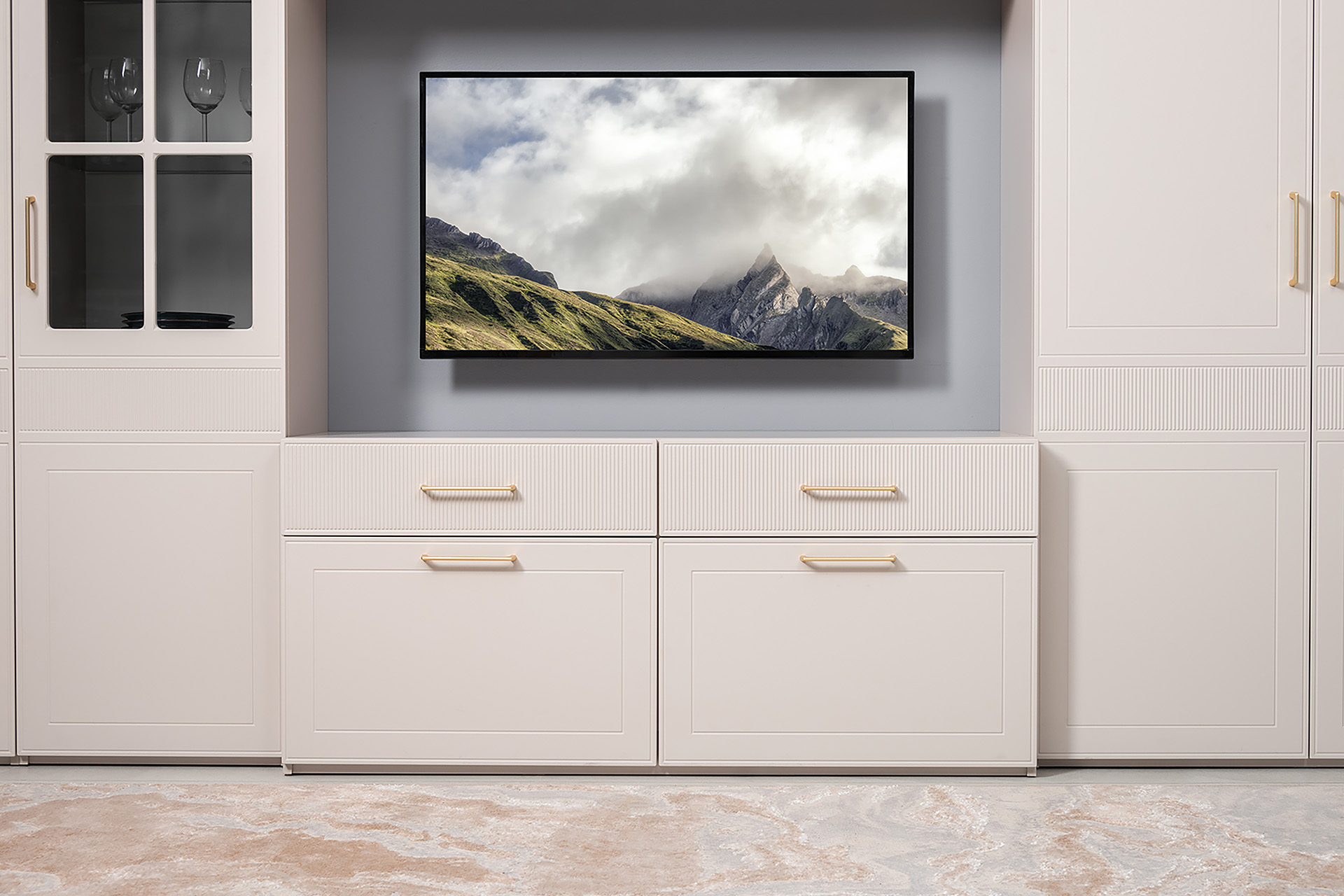 Тумба под ТВ Ричфорд 16.61 кашемир 5981 BS, моно керамика D166-2 ПВХ, белый PE шагрень